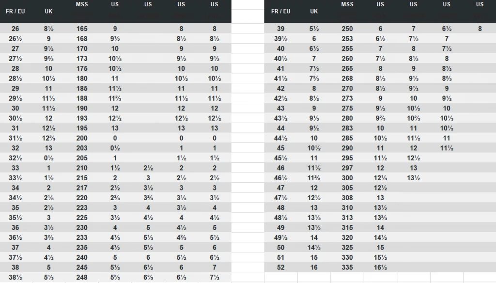 | Size ski boots | 35, 37, 38, 39, 42, 47, 48 |