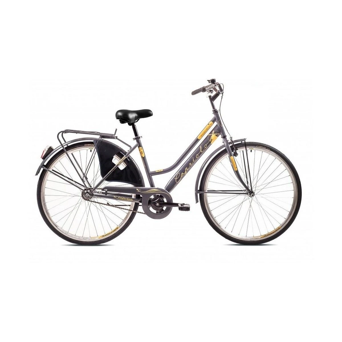 Description: women’s city bike with luggage frame and basket.