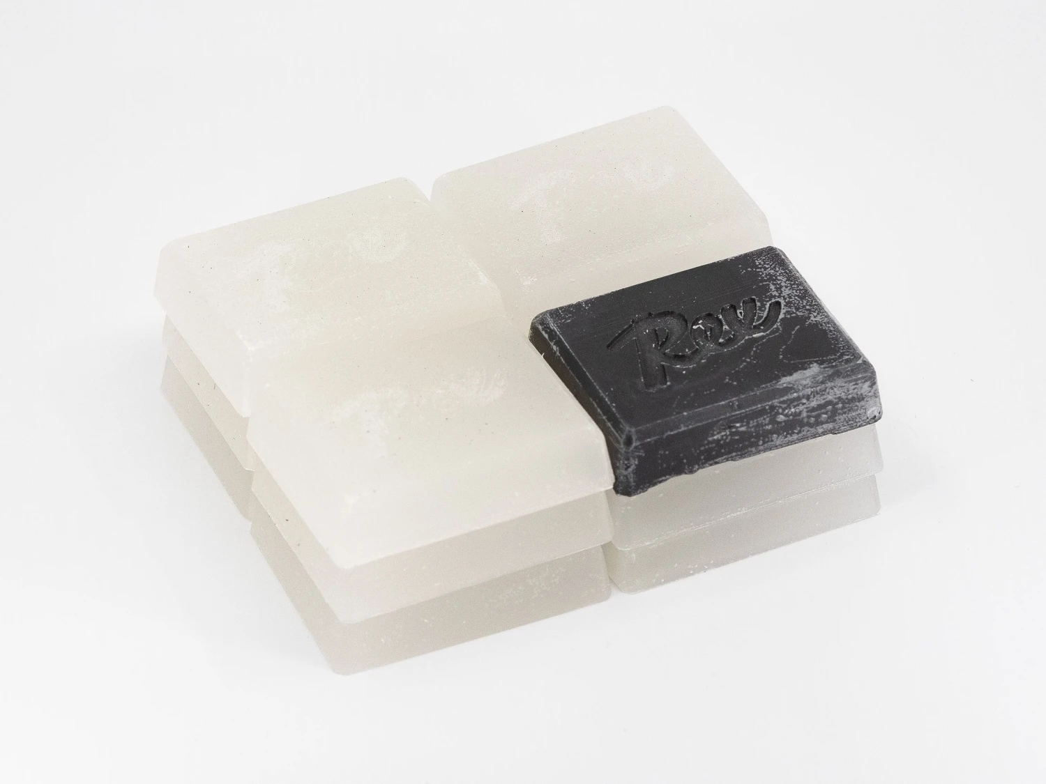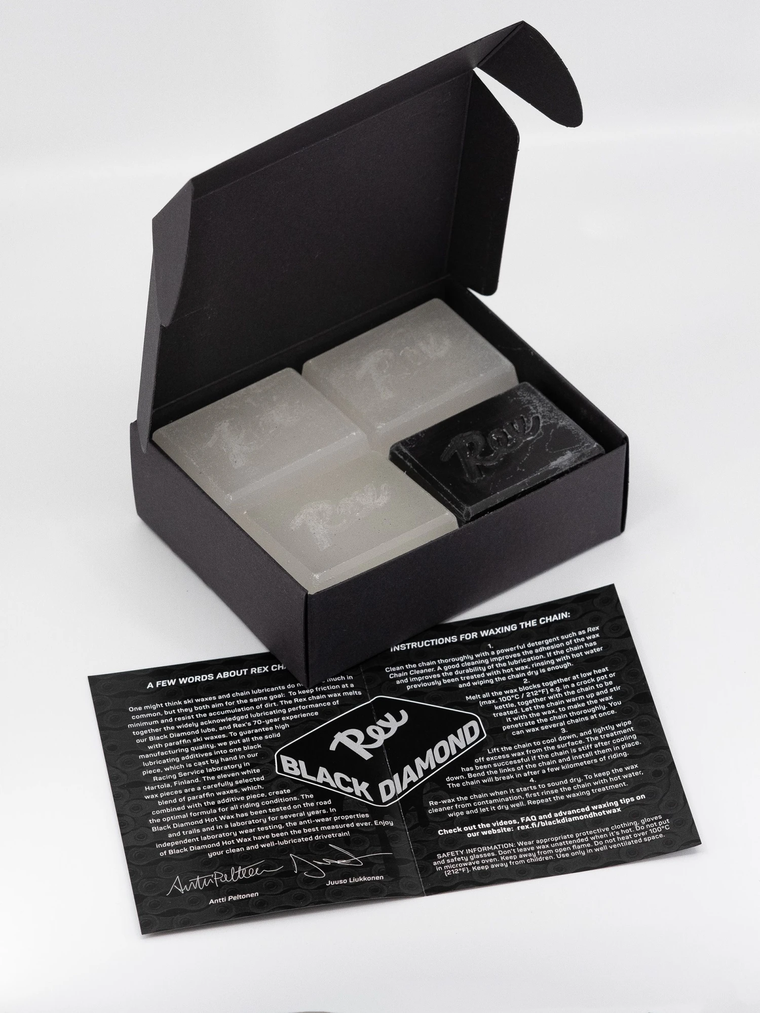 The Hot Wax consists of 11 base blocks made from a specially tailored paraffin mixture and a Black Diamond additive block so that you can create your own wax mixture. For the majority of applications, it is advisable to melt all 12 blocks together and soak one or more previously completely degreased chains in the liquid wax (below 100 °C!) for some time. After the chain has cooled, excess wax should be gently wiped off and the chain can be mounted. Even with this treatment, a chain was able to achieve a mileage of over 1000 kilometers on the test bench at the Zerofriction specialists in dry road conditions, until the wear on the chain increased measurably. Waxing the chain with a mixture of 4 paraffin blocks with a black diamond block was able to increase the mileage again to almost 1500 kilometers. Thanks to the carefully coordinated additives, the Black Diamond Hot Wax was also able to set new mileage records in the simulated off-road test. Black Diamond Hot Wax is manufactured in their own factory in Hartola, Finland.