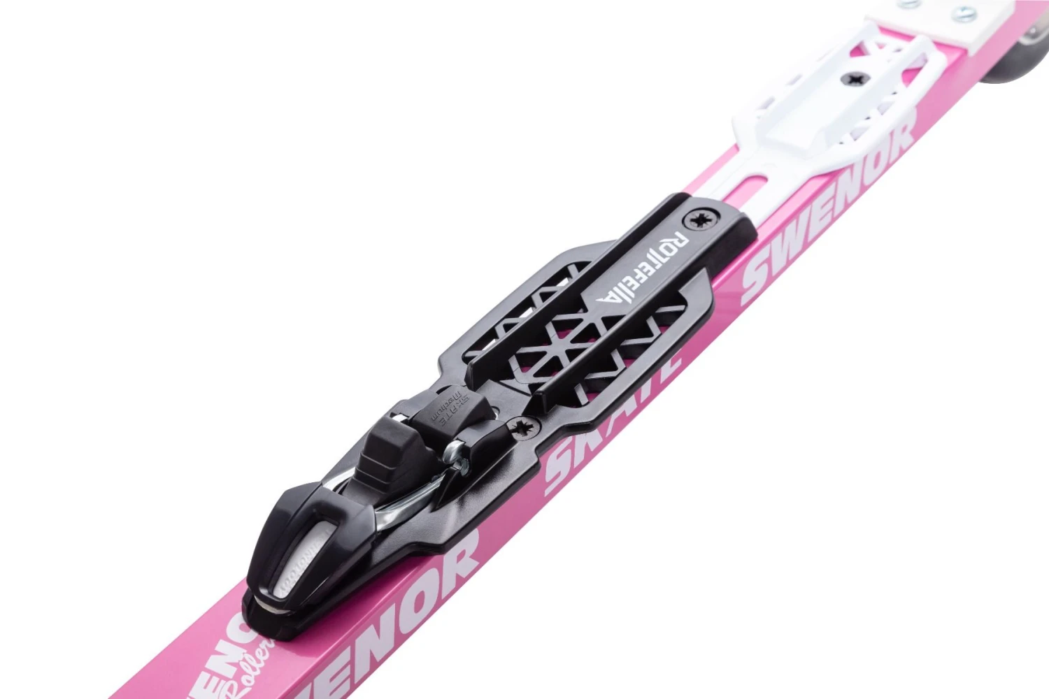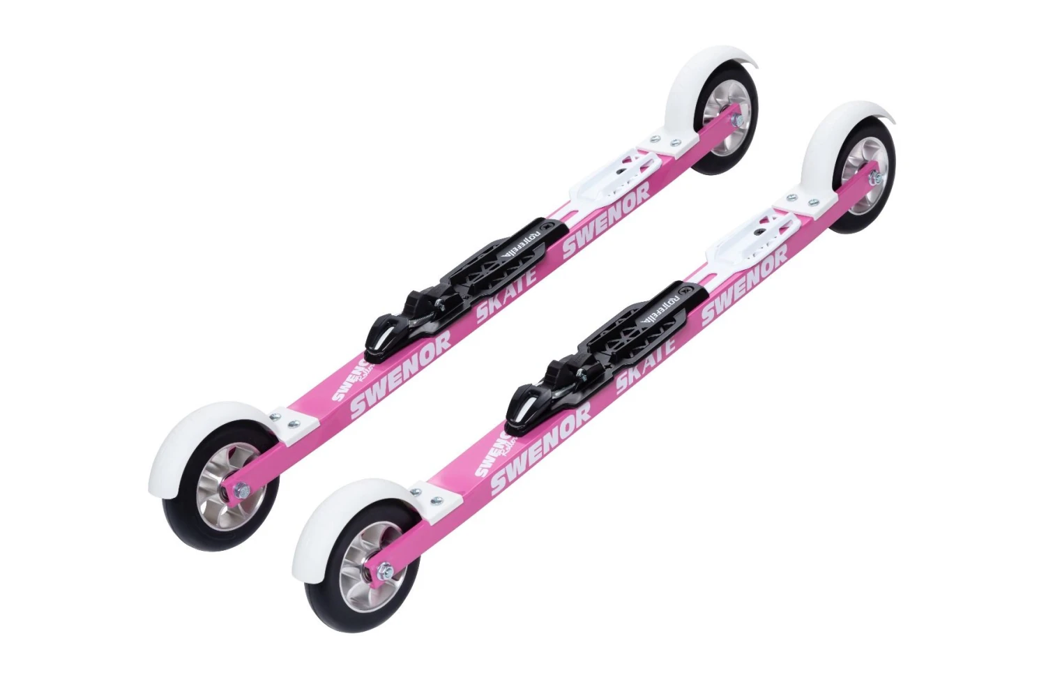Swenor Aluminium Skate PINK rollerskis and premounted Rottefella Rollerski Skate bindings.
